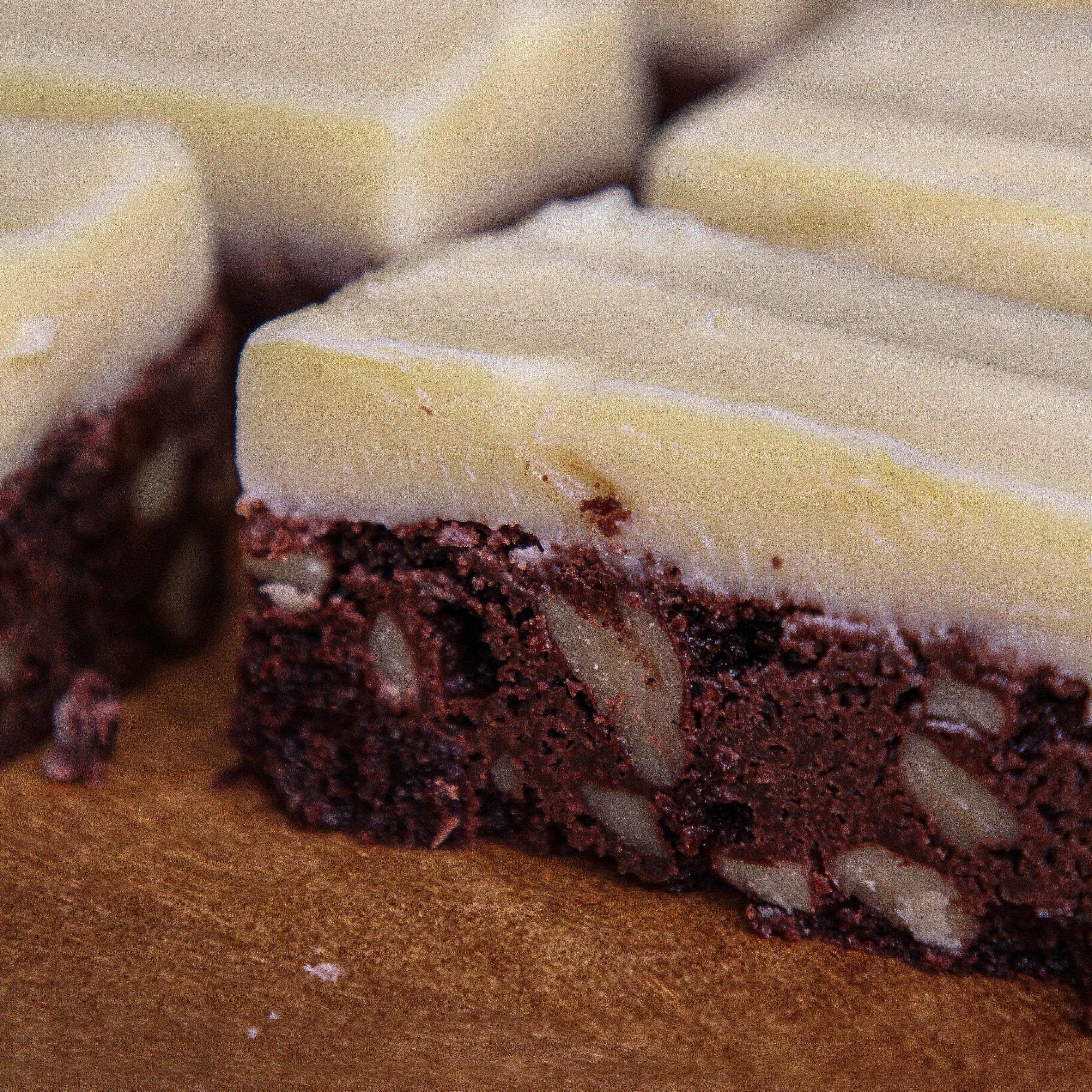 Rich and fudgy chocolate brownie studded with pecans, topped with a silky white chocolate ganache.